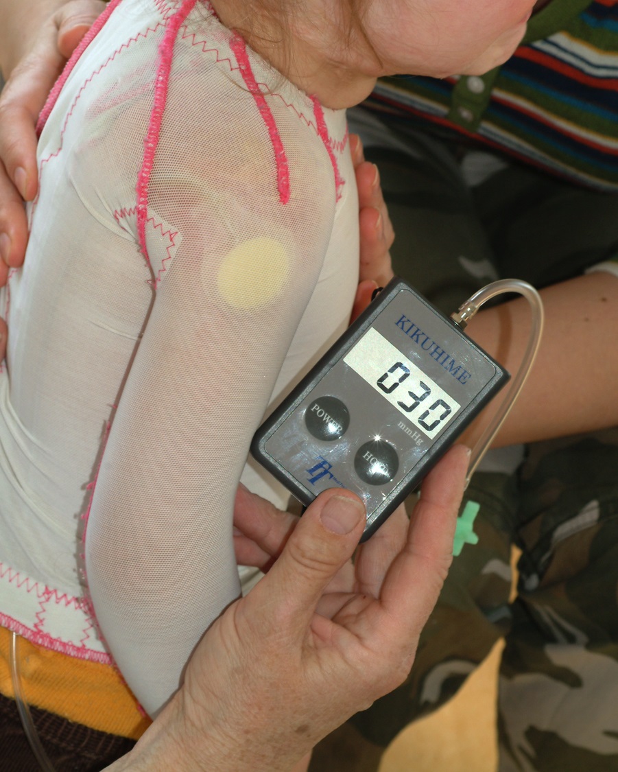 Mit einem speziellen Druckmessgerät kann ich überprüfen, ob die Kompressionsbekleidung den optimalen Druck auf die Narbe ausübt.