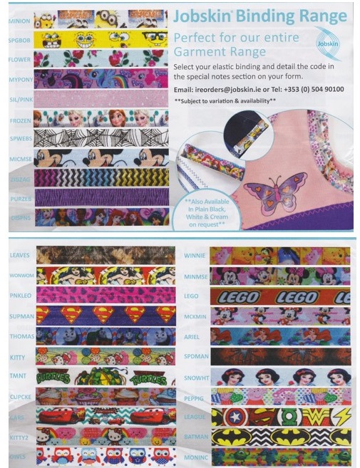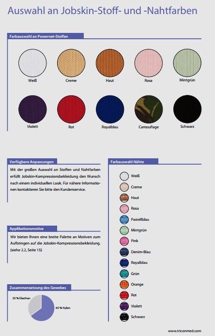 Die Jobskin-Kompressionskleidung bietet eine große Auswahl an Farben für Stoff und Nähte. Für Kinder gibt es zusätzlich Verzierungen für die Bündchen.